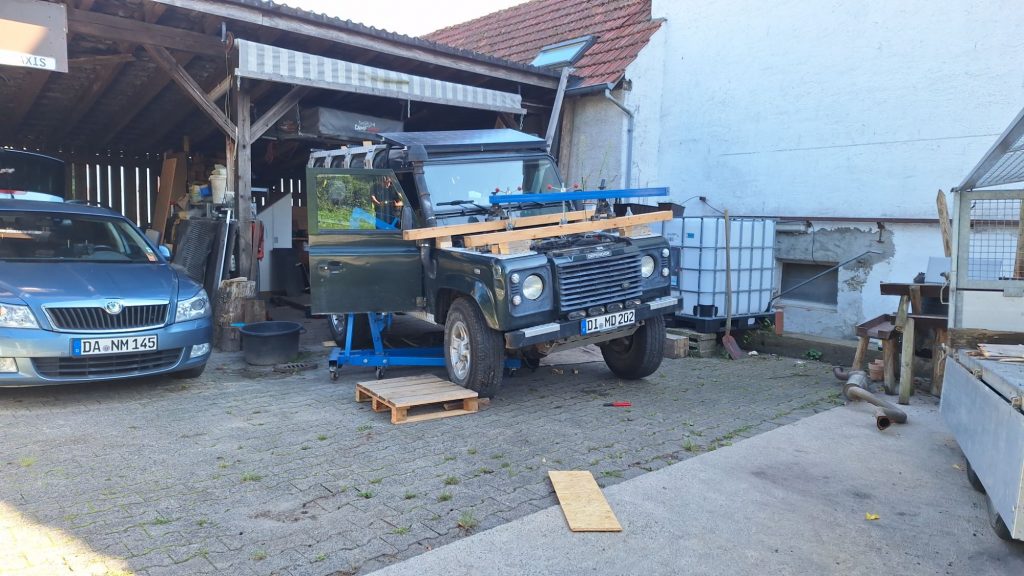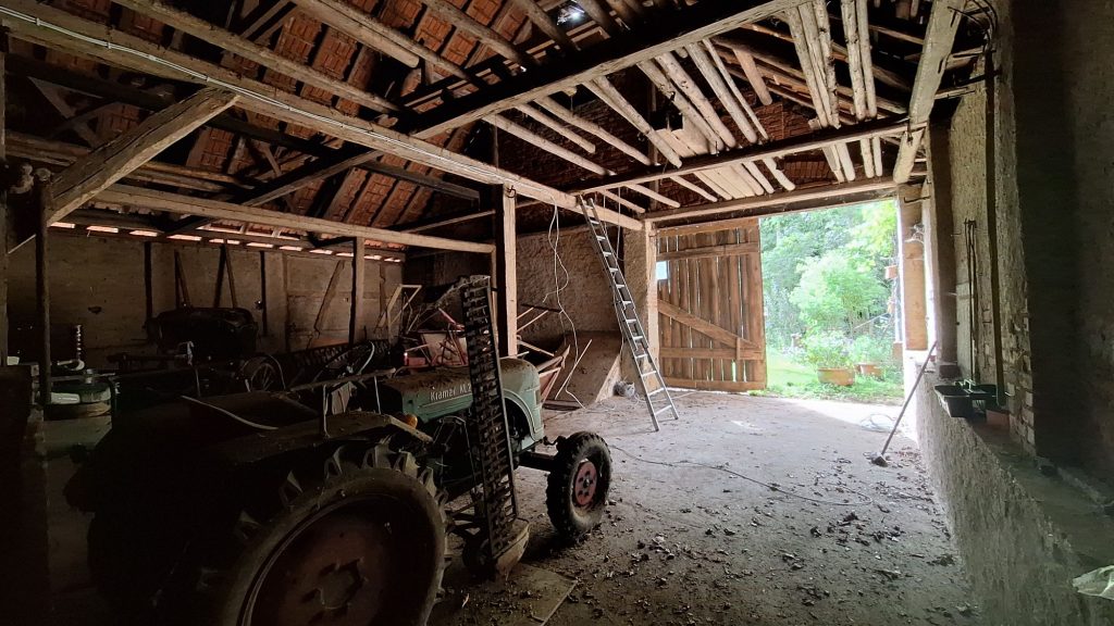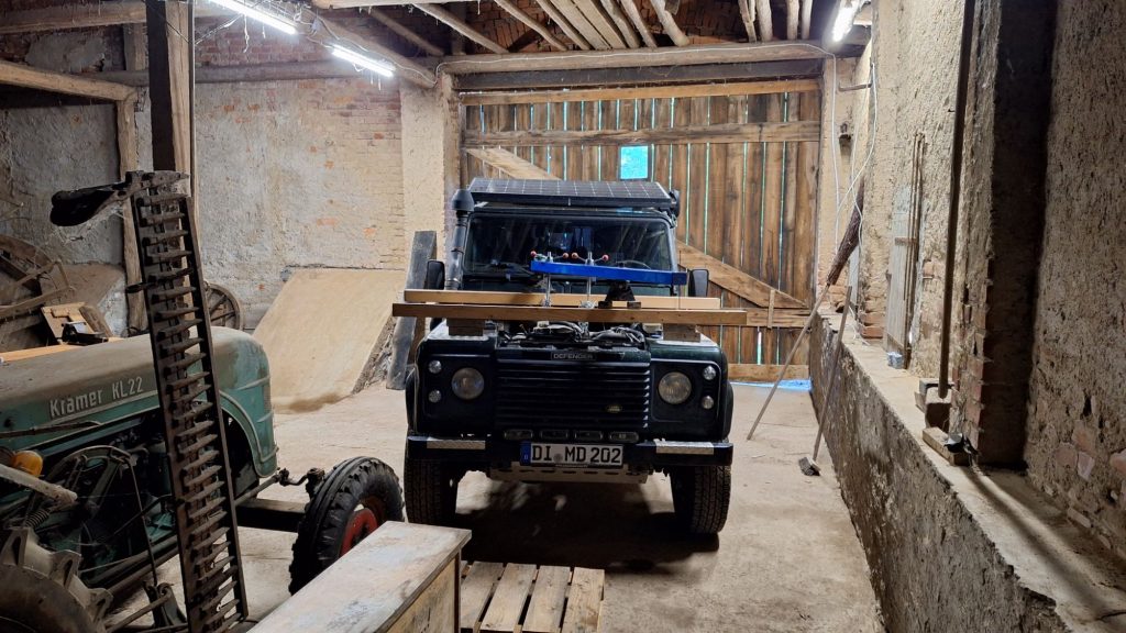 Nach diesem Befund war klar, in diesem Zustand fährt das Inselauto nirgendwo mehr hin! Also mussten die Vorbereitungen für den Getriebeausbau und Überholung getroffen werden. Wer kann die Revision machen, wo kann ich vernünftig aus und einbauen. Bei mir unter dem Carport kann ich zwar schon einigermaßen gut arbeiten, bin aber doch ziemlich Wetterabhängig. In Anbetracht des fortgeschrittenen Jahresverlauf (den Befund hatte ich am 21.8.25) und des damit resultierenden Wetters wäre eine Scheune zum Schrauben genau das richtige. Da fiel mir meine Nachbarin (der ich schon ein paar kleinere Handreichungen gemacht hatte) ein, die mir anbot: Wenn ich mal etwas für Dich machen kann, melde Dich! Also ging ich zu ihr rüber und meinte, dass es jetzt soweit sei, dass sie (indirekt) etwas für mich tun könne, ich könnte nämlich einen überdachten Platz zum arbeiten gebrauchen. Und siehe da, sie war einverstanden. Dies wird der Unterstand vom Landy bis er wieder fahrtüchtig ist:
