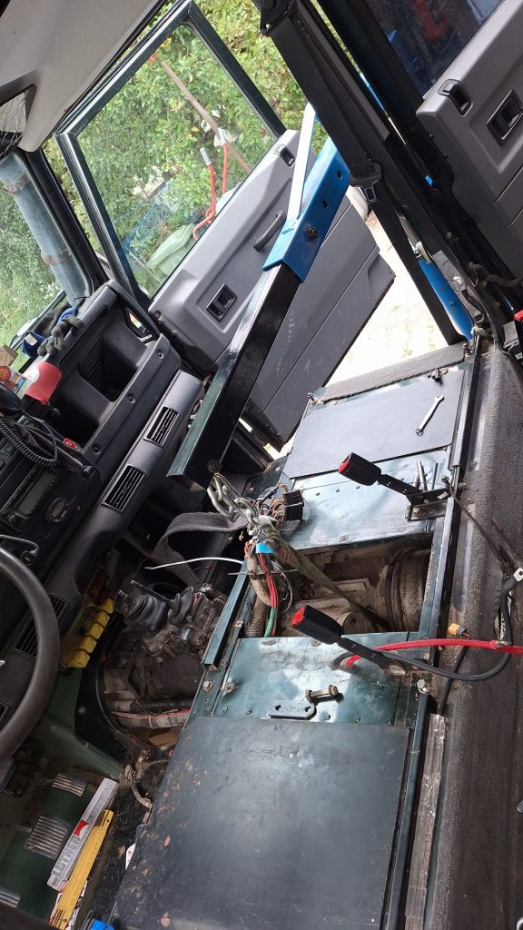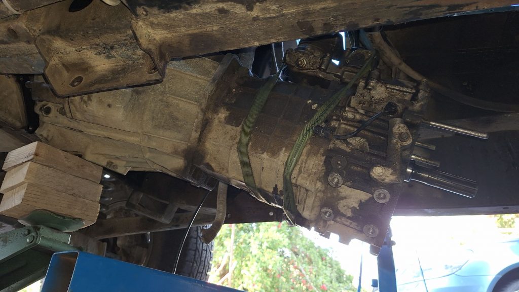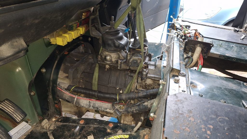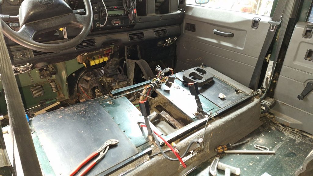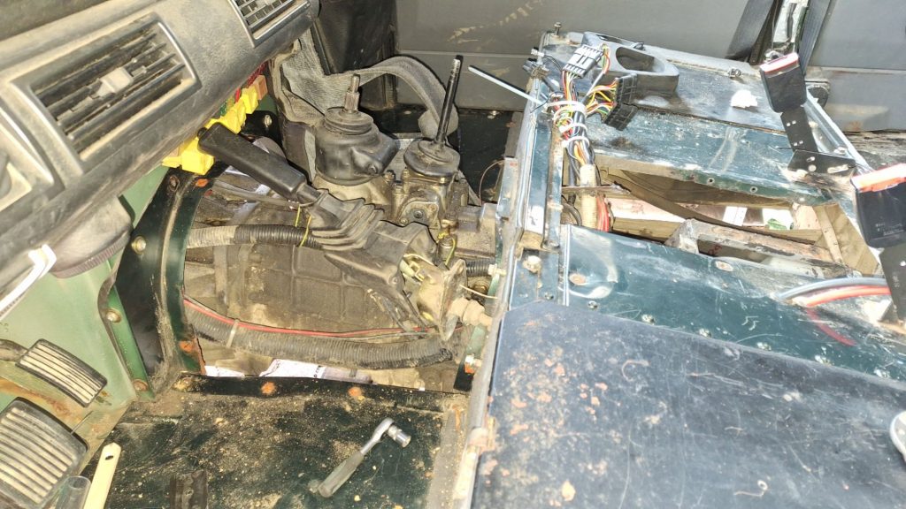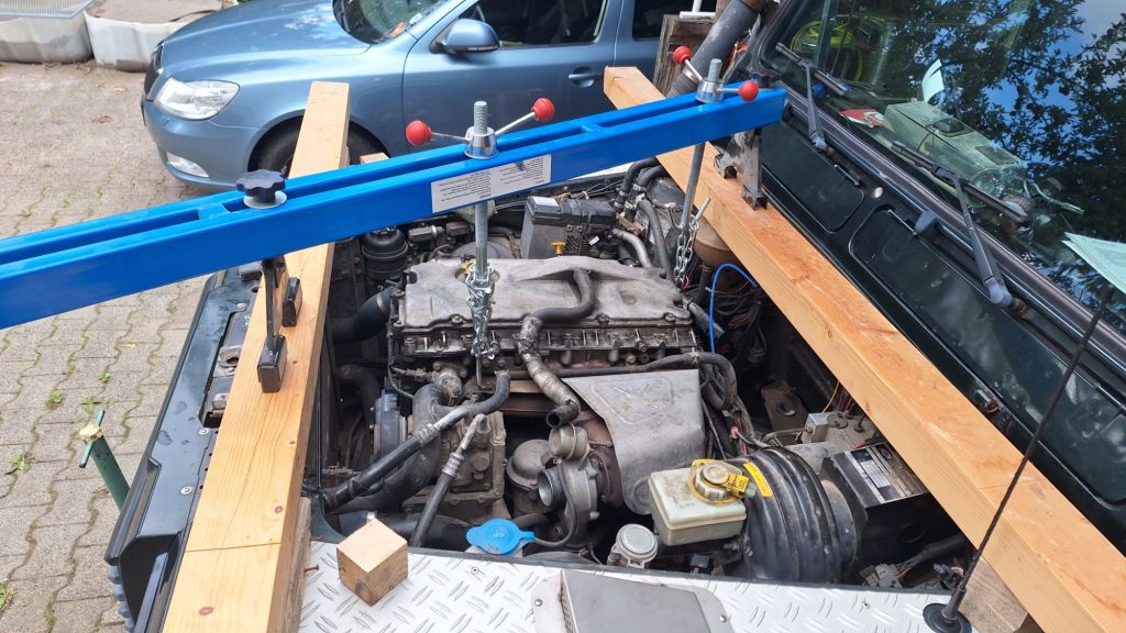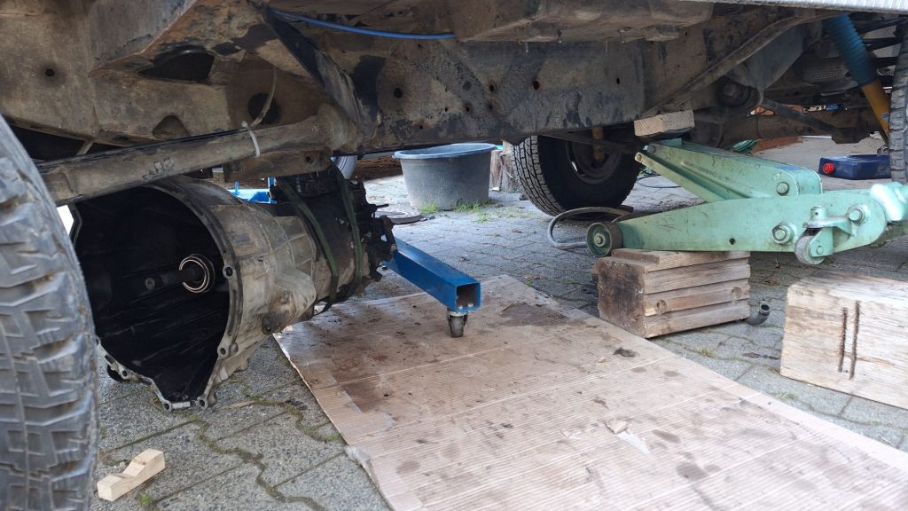 Nachdem der Zugang von oben fertig war, ging es mit den Freilegearbeiten von unten weiter. Ein Knackpunkt ist die Traverse unterhalb des Getriebes. Diese ist auf Spannung im Rahmen eingebaut (zumindest bei mir) Um sie ausbauen zu können, muss der Rahmen mit einem Wagenheber leicht gespreizt werden. Mit dem alten serienmäßigen Wagenheber vom Defender klappt das recht leicht, nur „leider“ habe ich den im Rahmen der letzten Aufräumaktion dem Wertstoffkreislauf zugeführt. Also musste ich mir etwas überlegen. Der kleine hydraulische Wagenheber zusammen mit einem Kantholz hat den Dienst recht gut übernommen.