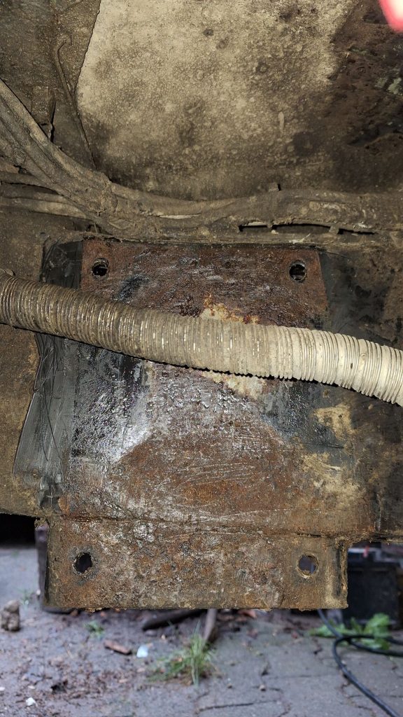 Die Nutellataktik zahlte sich aus, denn als die Traverse heraus war, zeigte sich, dass die Stelle unter den Seitenblechen der Traverse nicht weiter gerostet ist. Dieses Mal werde ich weitere Anti-Rost-Maßnahmen ergreifen um den Rahmen vor Lochfraß zu schützen. Es gab nämlich auch schon Leute, die statt des verrosteten Blechs des Rahmens einen praktischen Zugang zum Inneren des Rahmens gefunden hatten, wenn die Traverse abgenommen wird.