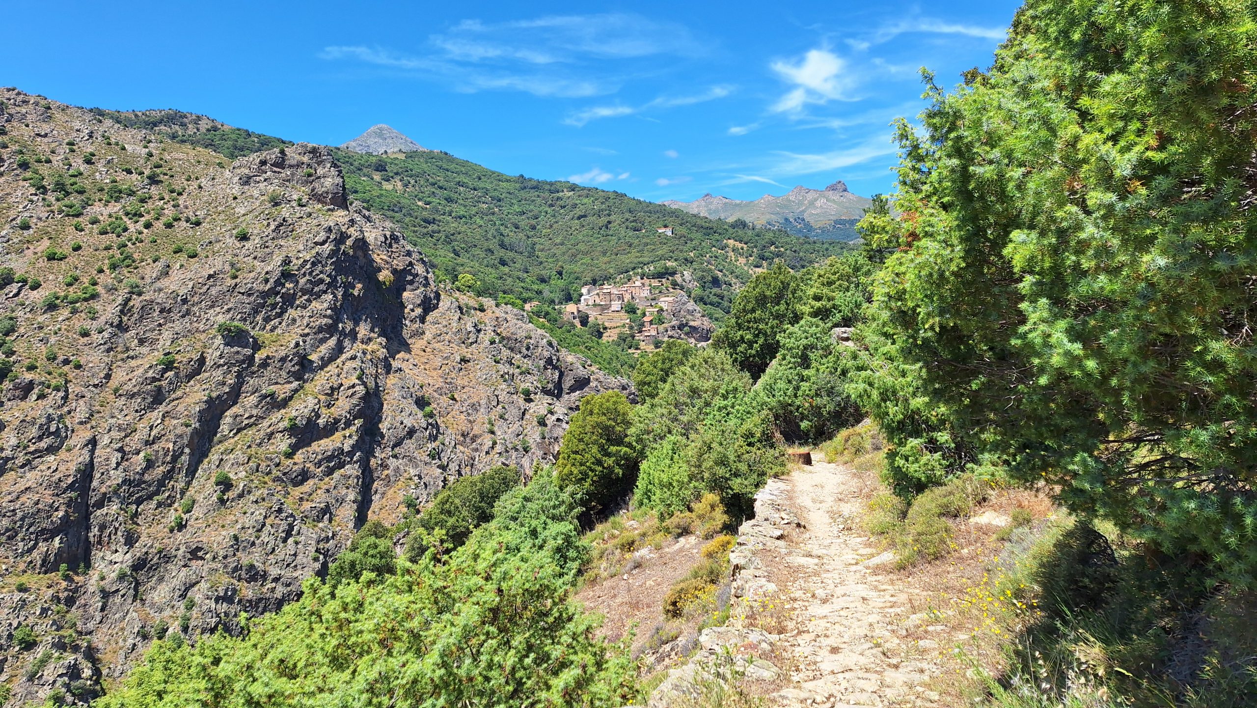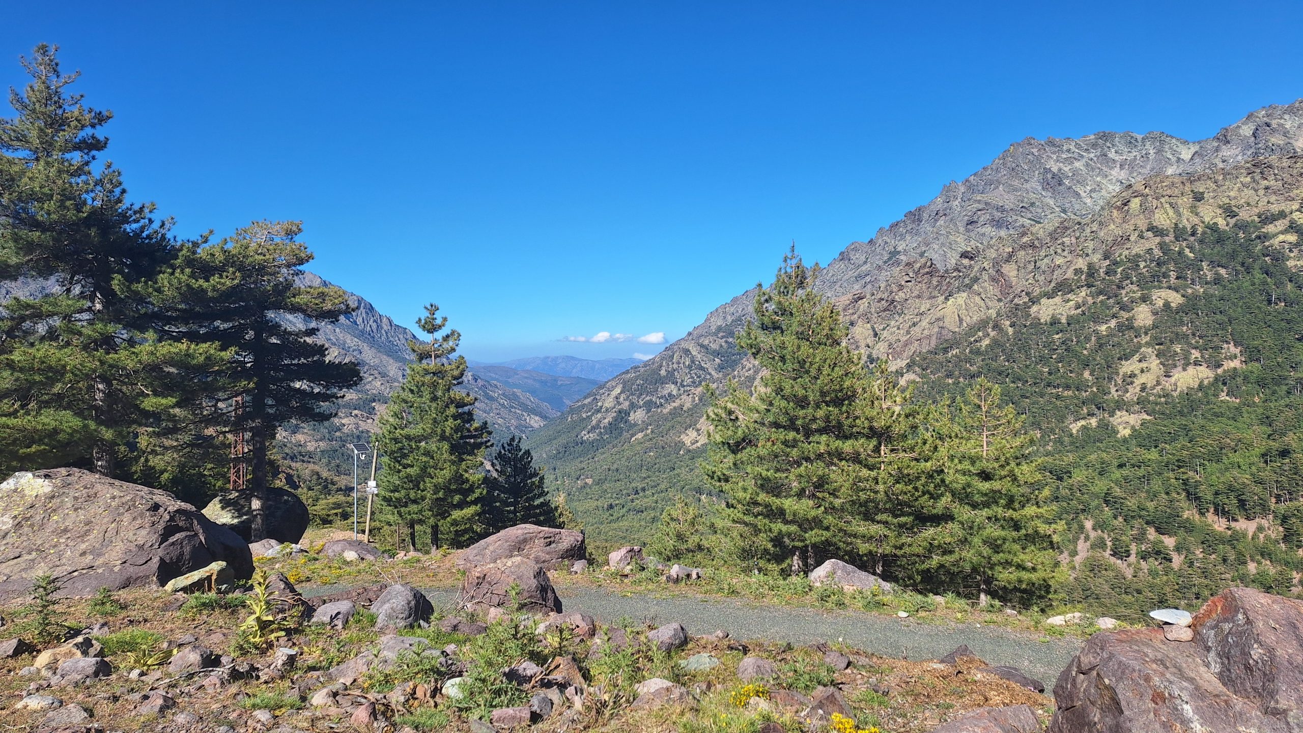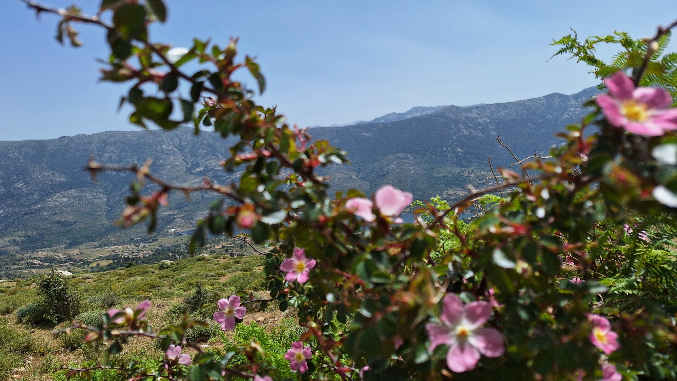 ..sollte es heute werden. Vom Camping über diverse Serpentinen bergauf durch die korsische Vegetation, von der sehr viele Pflanzen am Blühen sind. Der Blick über den Stausee und die Berge…