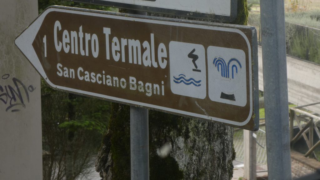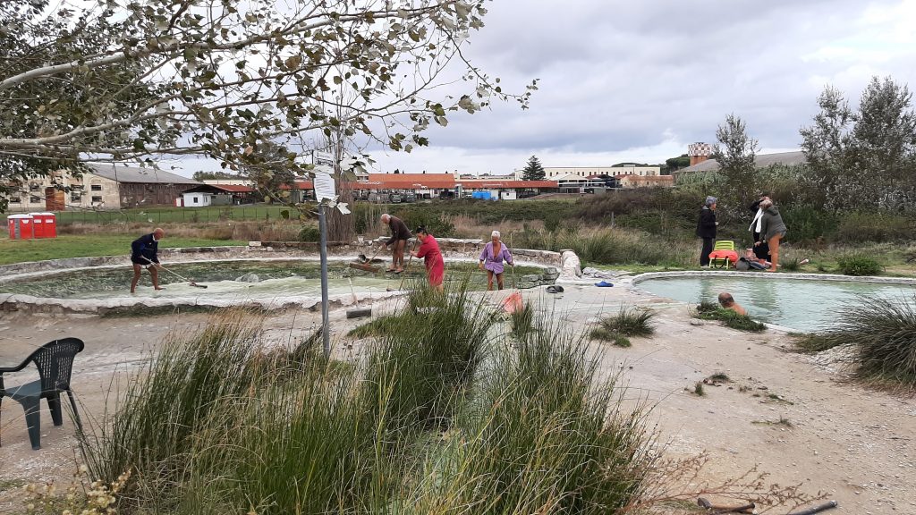 Zurück bei den Autos haben wir dann die Route nach Viterbo berechnet und hatten eine kurze Fahrt zur ersten Quelle in Viterbo, „La Masse“ ist seit vier Jahren trocken und die andern Becken sind gesperrt, da man sich entschieden hat dort eine Bezahltherme zu bauen. Etwas geknickt sind wir dann weiter gefahren, zu den beiden öffentlichen Thermalbädern Bullicame, diese wurde gerade von einigen älteren Herrschaften mit Besen gereinigt, also nix mit baden und Caletti, ist auch gegenüber der Militärbasis und somit Feng-Shui-technisch unschön. Dort waren wir dann kurz baden, sehr schönes Wasser, heiß und ausreichend große Becken.