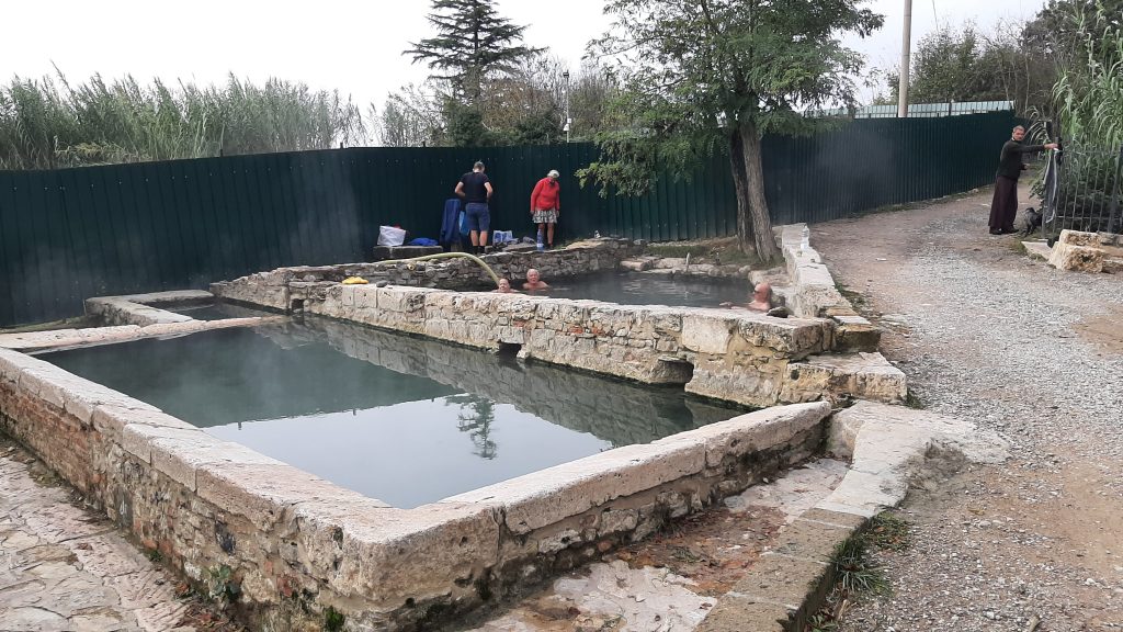 Dann haben wir uns fahrfertig gemacht um wieder in die Region der Quellen in der Toskana zu fahren. Unser Tagesziel war San Casciano dei Bagni. Dort gibt es einen großen Parkplatz und man muss ein paar Schritte zu den Badebecken laufen. Die Anlage ist sehr gepflegt und die Becken sehr angenehm von der Temperatur her. Auch hier haben wir einen Badegang am Nachmittag gemacht, bevor wir unseren Schlafplatz auskundschaftet haben. Nach dem wir einen brauchbaren Platz im Wald gefunden haben, ging es nochmals zur Quelle, baden in der Abenddämmerung, bis es dunkel wurde.