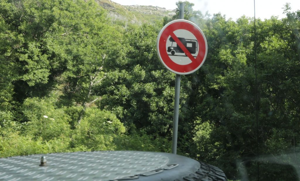…und rein nach Bastia. So früh am Morgen ist noch nicht viel los, wenn man von den ganzen Autos und Campern absieht die von unserer und der roten Fähre strömen. Also versuchen raus aus dem Getümmel zu kommen und mich erstmal sortieren. Da ich es nicht darauf anlege, mich in den Tourizentren herumzutreiben, fuhr ich nach Norden, zum Col de St Jean. Eine weißwarenfreie Zone, denn die Straße ist nicht camperfreundlich, was auch beschildert ist: