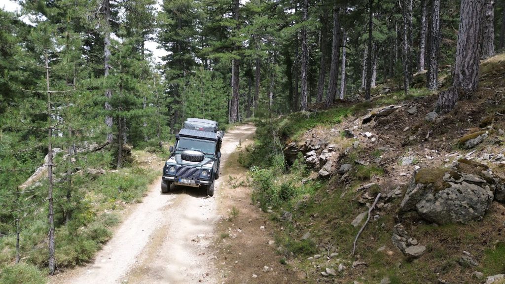 Bei der nächsten Auffahrt in die Berge war auch ein Durchfahrt verboten Schild, aber ich musste dann umdrehen und fuhr weiter um einen Platz dafür zu finden. An diesem Platz stand ein Korse der sein Auto belud und er meinte, dass es hier nicht erlaubt sei, weiterzufahren und die Piste eh bald aufhöre. Er zeigte mir auf der Karte, wo eine legal befahrbare Piste war, die ich dann auch nahm. Zum Schluss meinte er noch: NO CAMPING, am Abend musst du wieder runterfahren…