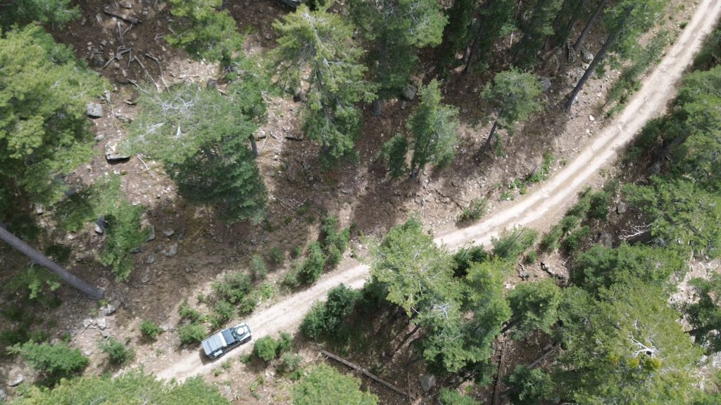 Die Piste ließ sich recht gut fahren bis zu der Passhöhe, und man kann auf der anderen Seite noch etwas weiterfahren, aber nicht bis ganz herunter ins Tal. Also drehte ich am Pass und fuhr wieder runter. Im Wald nahm ich einen Abzweig, der keine Verbotsschilder hatte. Letztendlich kam ich an der Einfahrt heraus, wo ich heute vormittag an dem Verbotsschild umkehrte.