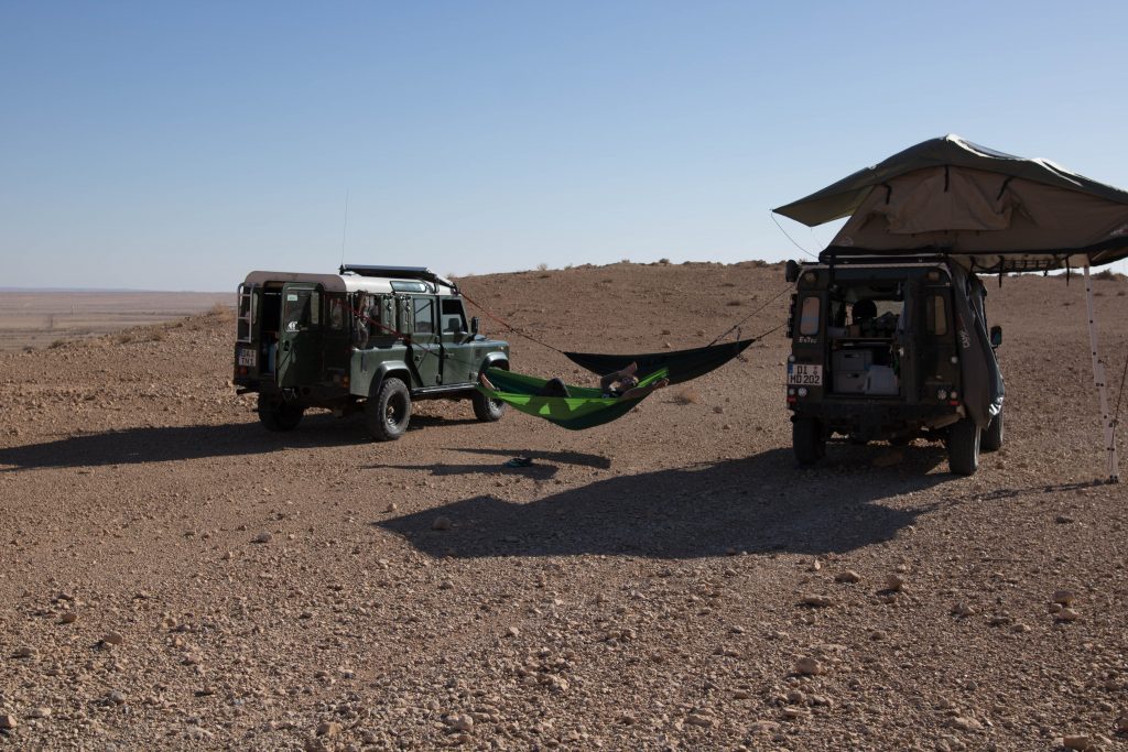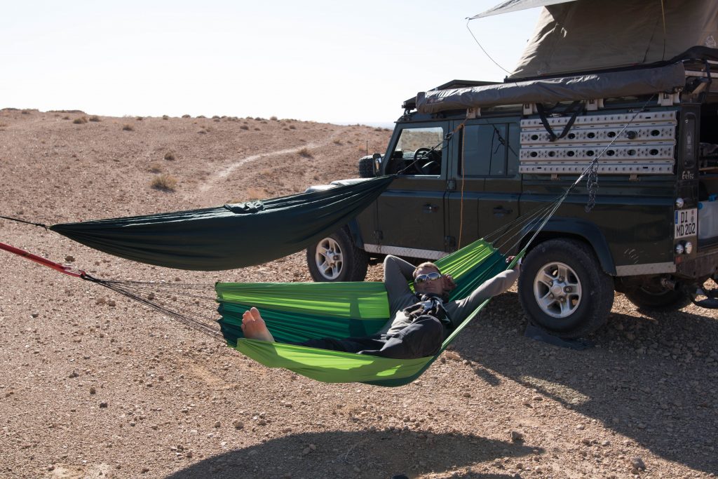 Nach der Erfrischung fuhren wir dann weiter zur Rommelpiste, wo wir an derem Beginn ein schönes Plateau fanden, wo wir die Nacht verbringen. Zum Schlafen war es aber noch viel zu früh, also spannten wir die Hängematten zwischen den Autos und machten etwas Pause.