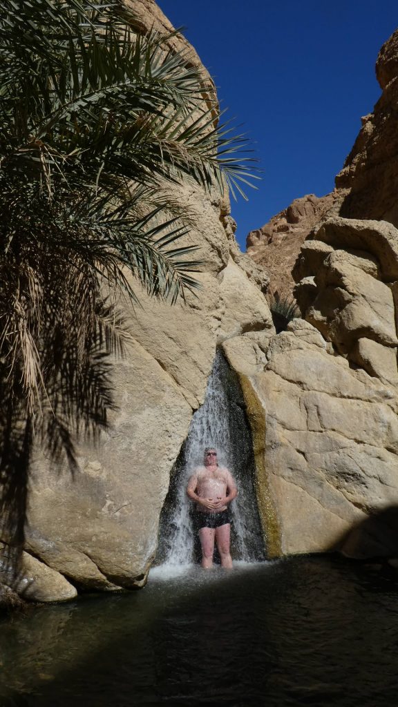 Die nächste Station heute war die Quelle in Chebika. Dort auf dem Parkplatz angekommen kamen auch schon die Schmeißfliegen…. öhm, zwei Händler an und boten uns ihre Steine und Sandrosen an. Es hat etwas gedauert, bis wir den Händler und den potentiellen Guide abgeschüttelt hatten und wir uns auf den Fußweg zur Quelle machten. Auf dem Weg dorthin waren noch einige andere Händler, die uns aber weitestgehend in Ruhe ließen.