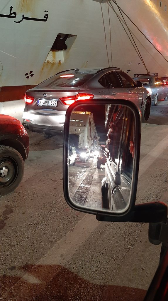 Alles in Allem zog sich das Einschiffen über fünf nervenaufreibende Stunden hin. Erst die obligatorischen Helfer, die dir zeigen wollen, was du schon weißt und dann die offiziellen Beamten von Zoll und Polizei. Wenn du die hinter dir hast kommen immer mal wieder Leute an deinem Autofenster vorbei und wollen deinen Reisepass oder das Fähticket sehen oder ins Auto schauen. Und das nicht ohne Grund, es treiben sich einige Jugendliche auf dem Hafengelände herum, die versuchen sich unter einem der LKW zu verstecken – haben wir beobachtet. Dann warten wir mit laufenden Motoren, da es immer mal 3m vorwärts geht, auf die Einfahrt in den Bauch der Fähre.
