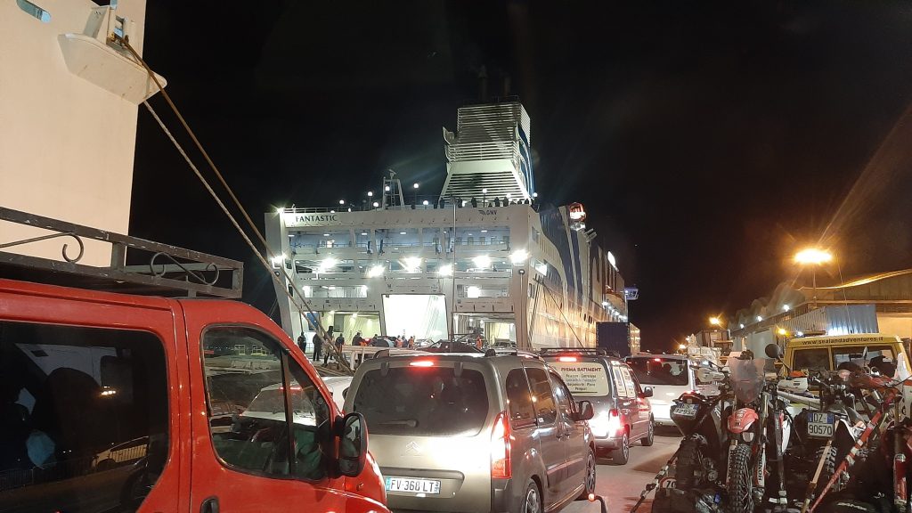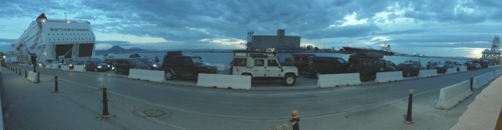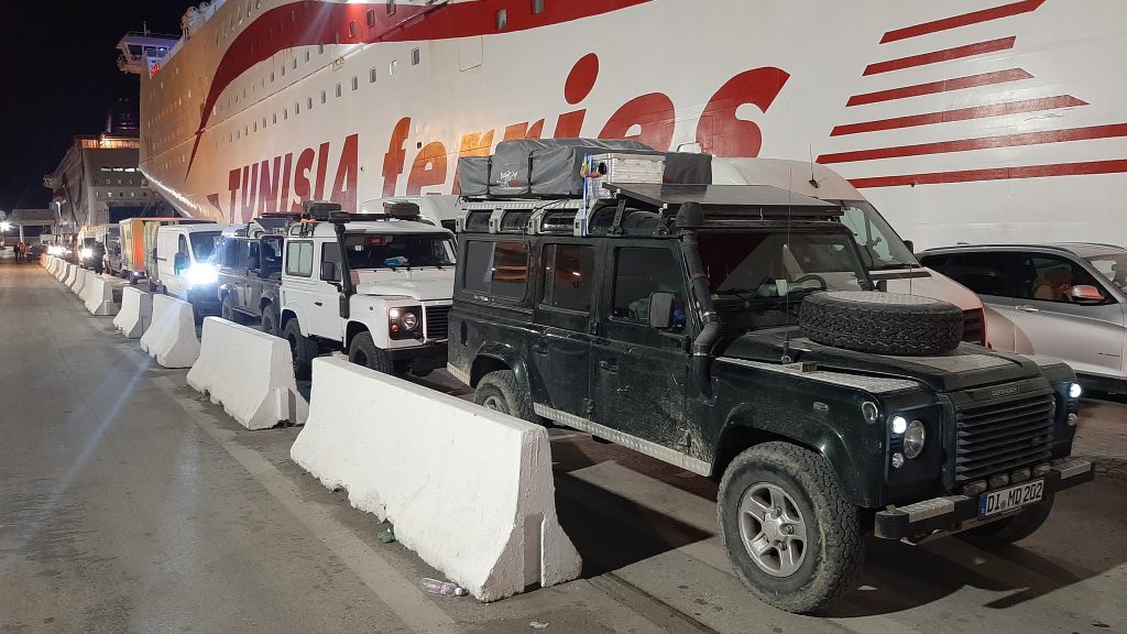 Dort haben wir eine große Gruppe deutscher Defender getroffen, die wohl einen Tag vor uns zum verlorenen See fuhren. Das hat uns der gute Mann vom Cafe am Tembaine erzählt dass er diese Gruppe gesehen hatte. In der Warteschlange war auch ein italienischer 90er Defender, der Probleme mit der Kupplung hat, und Angst hatte, mit dem Stop and Go in der Warteschlange seine Kupplung endgültig zu schrotten. Da ich meine Schleppstange dabei habe, habe ich ihn an den Haken genommen, und in Genua, wenn wir aus dem Hafen raus sind, wird er wieder selbst weiterfahren. Es ist mittlerweile 19:30 und in einer halben Stunde sollte die Fähre abfahren. Aber es werden immernoch LKW Trailer verladen und alle Autos stehen noch hier rum….
