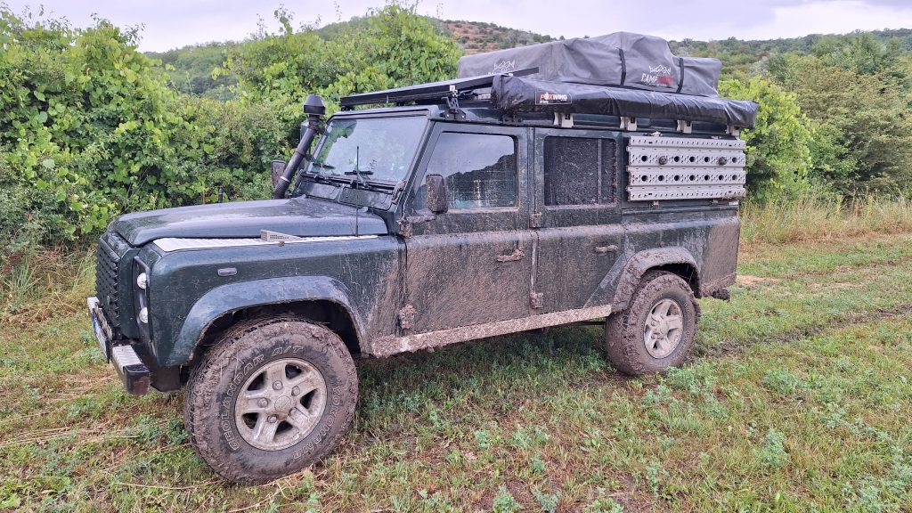 Die Plätze, die mir gut auf googlemaps erschienen, waren zwar über Feldwege erreichbar, aber dank des Regens über den Tag waren diese recht schlammig und das Auto rutschte manchmal mehr als dass es fuhr. Ab und an war ich noch in der Lage, die Richtung des Rutschens mit dem Lenkrad zu beeinflussen, so dass wir nicht stecken blieben. Irgendwann fanden wir eine gemähte Wiese, die gut für die Nacht ist. Nach dem Aussteigen offenbarte sich dann der vollständige äußere Zustand vom Landy. Dicke Schlammbrocken, wo man nur hinschaute oder -fasste. Um ein einigermaßen sauberes Handling am Auto zu ermöglichen, säuberten wir die Türgriffe, Fenster und Türen etwas, bevor es Abendessen gab.