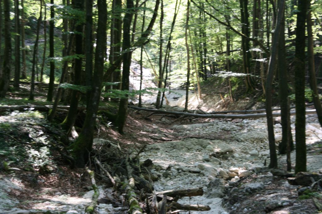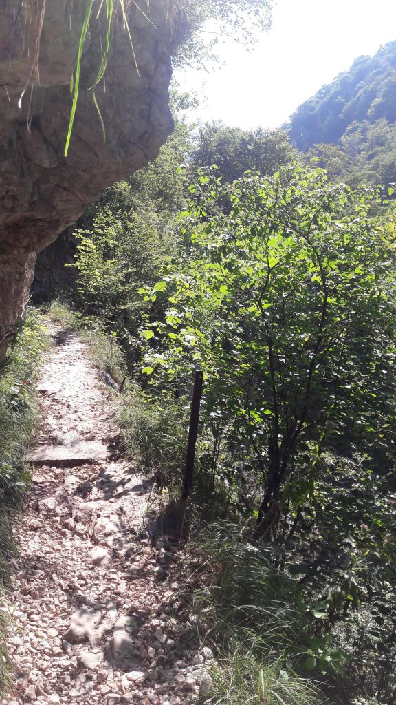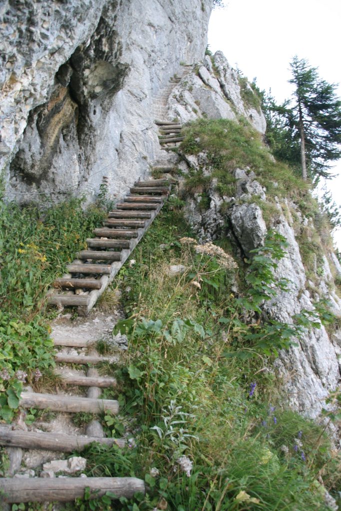 An der Rosittenbrücke habe ich eine Pause zur Stärkung und zum Abkühlen meiner Füße eingelegt bevor ich losging. Unmittelbar nach dem Einstieg geht es auf Stufen unterschiedlichster Art, Höhe und Bauart steil bergan. Unten im Tal war der Rosittenbach zu hören und der Pfad schlängelt sich weiter steil bergauf.